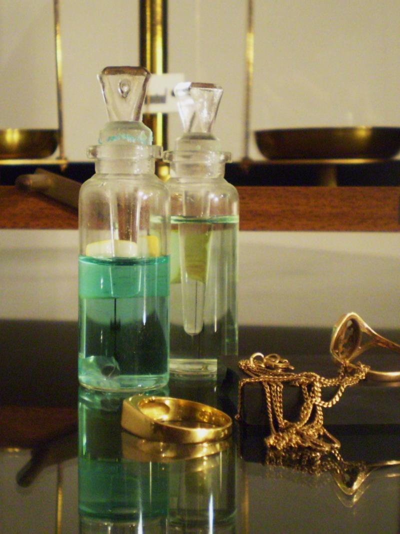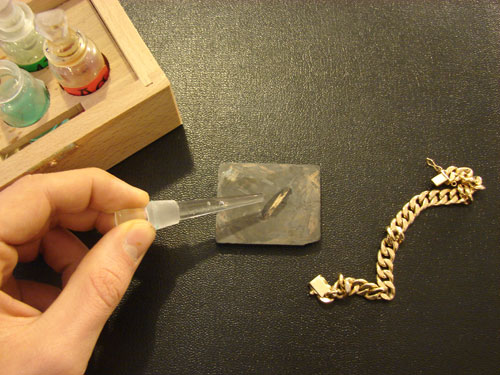 Em primeiro lugar, os artigos trazidos, jóias ou ouro usado, são analisados com o propósito de determinar o teor de metal precioso neles contido, quer por observação visual, através da análise de marcas e contraste, quer através do método clássico da Pedra de Toque (ver foto ao lado). De seguida, procedemos a uma pesagem em balança de precisão e logo depois efectuamos os cálculos com o objectivo de lhe apresentarmos o valor mais elevado no mercado. Os nossos cálculos obedecem a diversos critérios como: a cotação diária do ouro na bolsa de Londres, o género de artigos, o seu estado de conservação, entre outros.